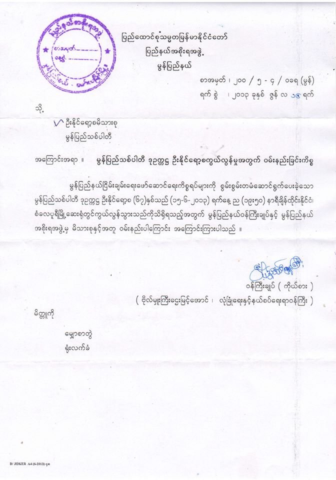 Formal letters were sent by a diverse range of political party leaders, revolutionary organizations, government staff, and Mon civil society groups.