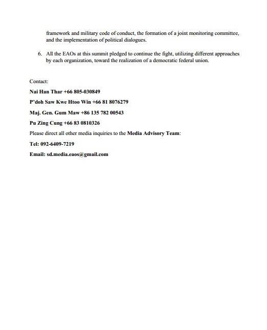 The statement went on to say, “All the EAOs at this summit pledged to continue the fight, utilizing different approaches by each organizations, toward the realization of a democratic federal union”.