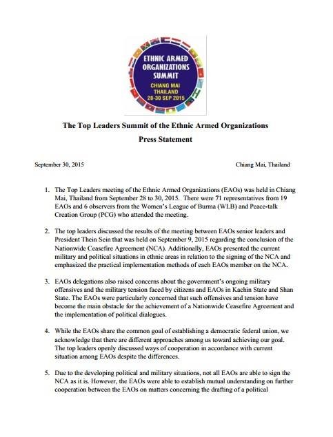 Ethnic armed groups held a summit with the top leaders of ethnic armed organizations (EAOs) in Chiang Mai, northern Thailand, from September 28 to 30. During the final day of the conference a statement was released including the statement, “Due to the developing political and military situations, not all ethnic armed groups are able to sign the NCA as it is”.