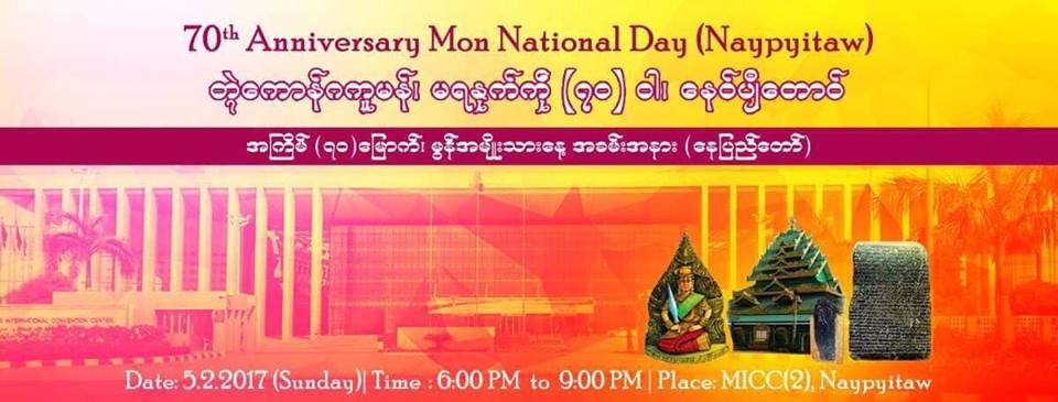 The 70th Anniversary of Mon National Day will be celebrated in Burma’s Nay Pyi Taw Capital on February 5 instead of February 12, due to Union Day also falling on February 12, according to the organizing committee for the 70th Mon National Day (Nay Pyi Taw).