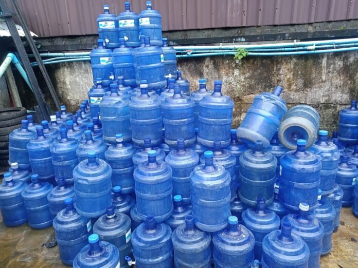Many households in urban areas rely entirely on delivered 20-liter purified water because their wells are located too close to toilets or other buildings, making the water unsuitable for drinking.