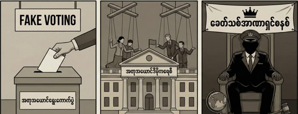 In 2026, a sham democratic system will be led by the former military-backed USDP, made up of retired military personnel who win seats through the election. However, under the 2008 Constitution, the current military dictator or coup leader, Min Aung Hlaing, could become president. Consequently, a government led by Min Aung Hlaing or another senior military general will establish a new-era authoritarian system under the guise of democracy within the framework of the 2008 Constitution.